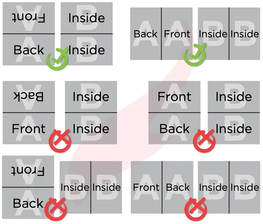 To ensure that your final product has the correct orientation, please make sure your files are set up with the appropriate head-to-head printing arrangement. Both the front and back files should be consistently aligned, either vertically or horizontally.